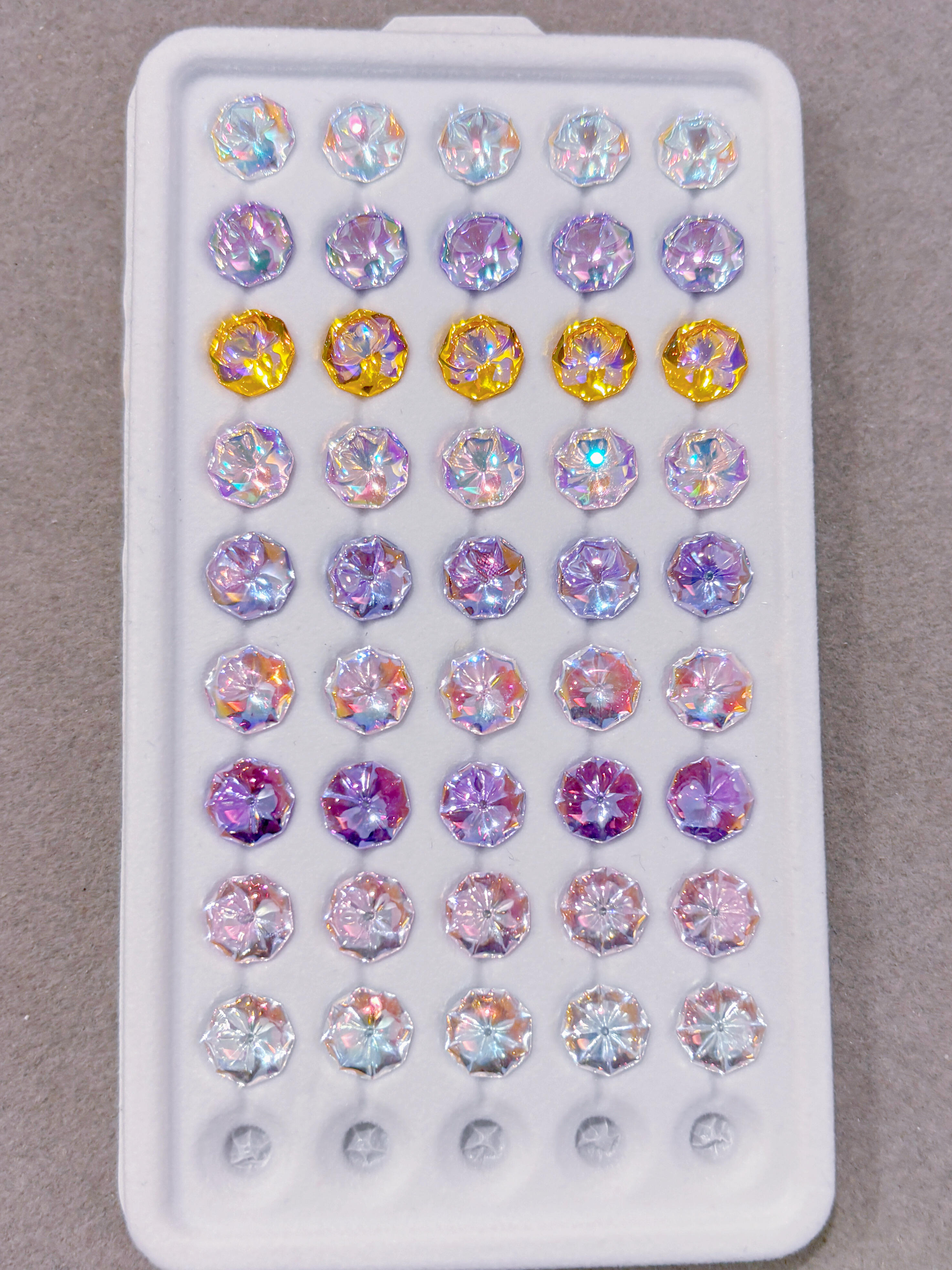 The surface is typically treated with a thin iridescent coating, allowing the stone to display shifting rainbow colors under different lighting angles.